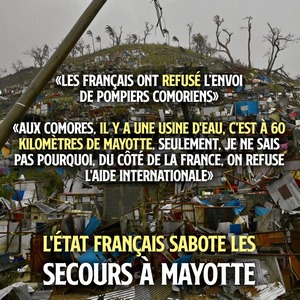 L’État français est manifestement défaillant face à cette crise : il a distribué des kits de survie composés d’une bouteille d’eau et d’une boite de thon. Pire, Macron, le 19 décembre, a débarqué en jet sur l’île dévastée pour injurier les habitant-es en détresse. Il leur a déclaré : « Si ce n’était pas la France, vous seriez 10.000 fois plus dans la merde ! »