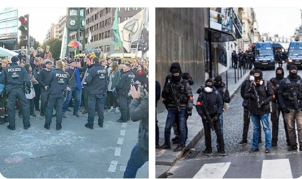 – à gauche, policiers allemands, pas d’armement, visages découverts, matricules individuels visibles dans le dos