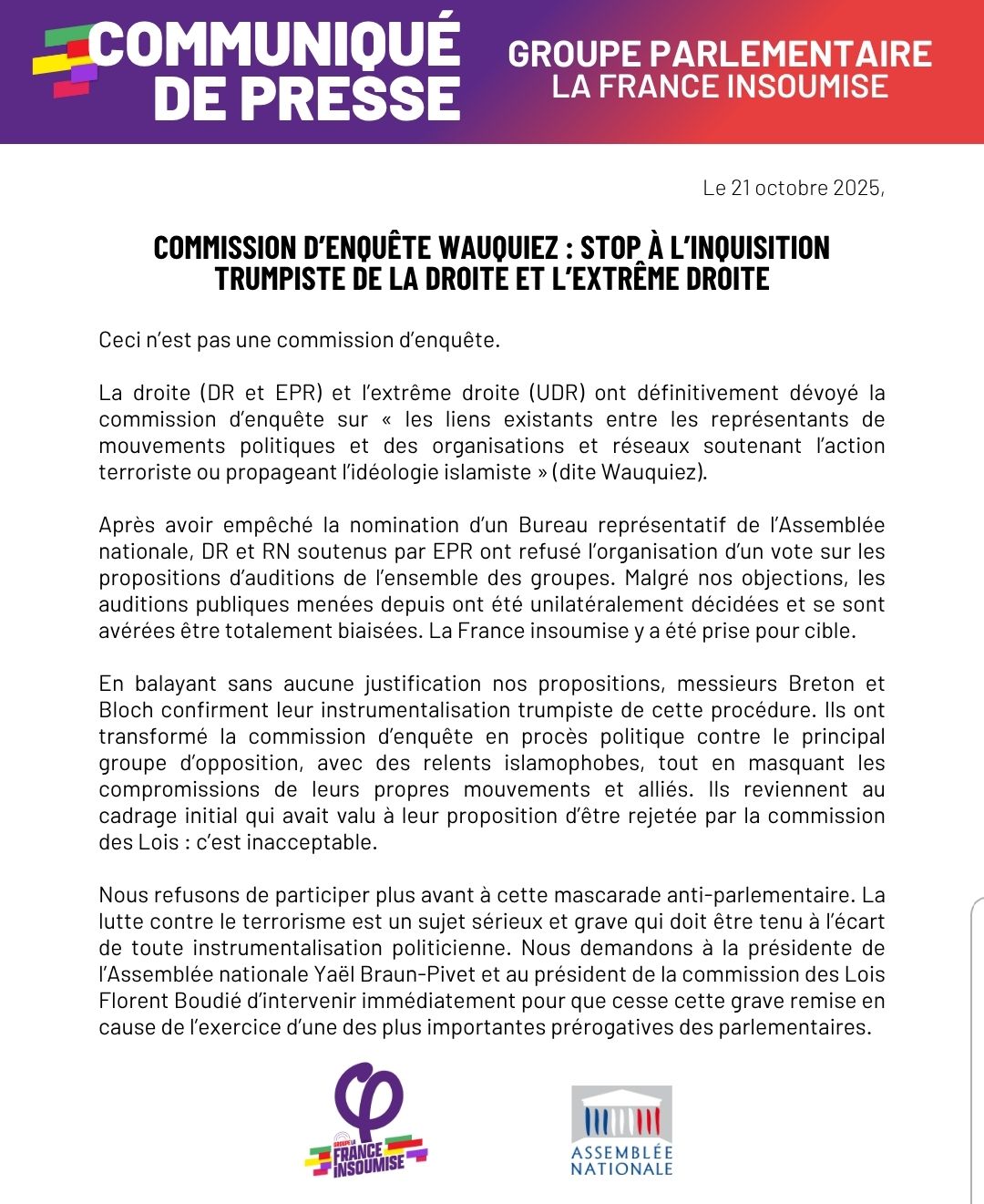 Dans un communiqué publié le 21 octobre, les élus insoumis évoquent une « inquisition trumpiste » ainsi qu’une « mascarade anti-parlementaire », Aymeric Caron dénonçant quant à lui une « alliance politique infâme ». Le groupe en a par ailleurs appelé à la présidente de l’Assemblée nationale Yaël Braun-Pivet et au président de la commission des lois Florent Boudié. Une requête restée lettre morte.