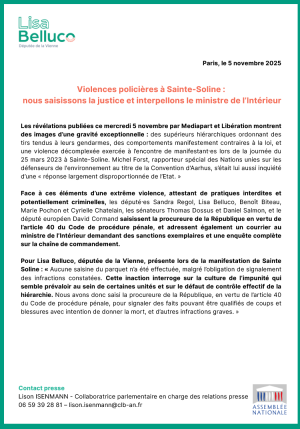 Suite aux images révélées ce jour par Libération et Mediapart montrant des violences policières d’une gravité inouïe à l’encontre des manifestant•es de Sainte-Soline en mars 2023, j’ai décidé, avec d’autres élu•es écologistes de l’Assemblée nationale, du Sénat et du Parlement européen, de saisir la procureure de la République. Nous signalons en effet des actions relevant d’une extrême violence et manifestement contraires à la loi.