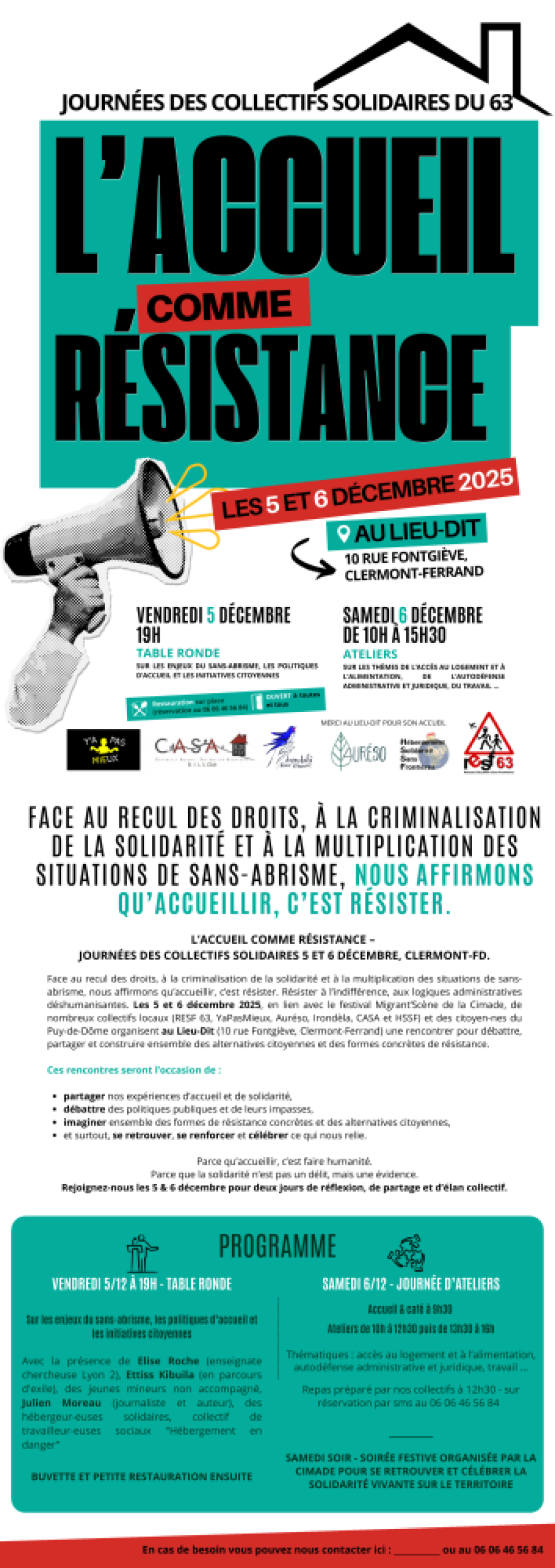 Dans le cadre du festival Migrant’Scène, de nombreux collectifs locaux (RESF 63, YaPasMieux, Auréso, Irondèla, Casa et HSSF) et des citoyen·nes du Puy-de-Dôme organisent une rencontre pour débattre, partager et construire des alternatives citoyennes. Ils et elles affirment que, face à la criminalisation de la solidarité et à la multiplication des situations de sans-abrisme, accueillir, c’est résister. (...)