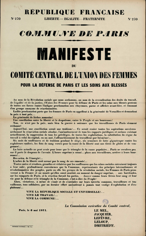 Au nom de la Révolution sociale que nous acclamons, au nom de la revendication des droits du travail, de l’égalité et de la justice, l’Union des Femmes pour la défense de Paris et les soins aux blessés proteste de toutes ses forces contre l’indigne proclamation aux citoyennes, parue et affichée avant-hier [celle qui était dans notre article d’avant-hier], et émanant d’un groupe anonyme de réactionnaires.