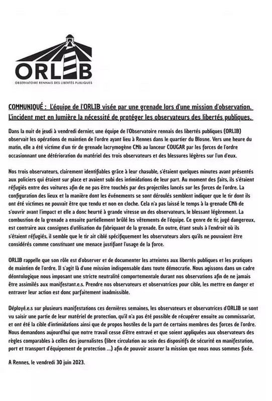 Dans la nuit de jeudi à vendredi, trois membres de l’organisation, chasubles reconnaissables sur le dos et casques vissés sur la tête, ont été dépêchés pour observer les opérations de maintien de l’ordre. Pendant leur mission, alors qu’ils se réfugiaient entre des voitures pour ne pas être touchés par des projectiles, ils affirment avoir été la cible d’une « grenade lacrymogène CM6 au lanceur COUGAR ».