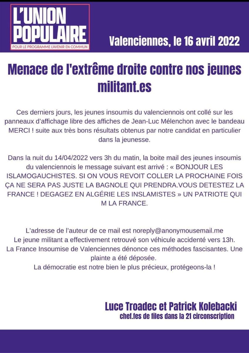 À Valenciennes des militants d’extrême-droite ont menacé de morts des membres de l’union populaire et ont revendiqué le saccage de la voiture de l’un d’eux.