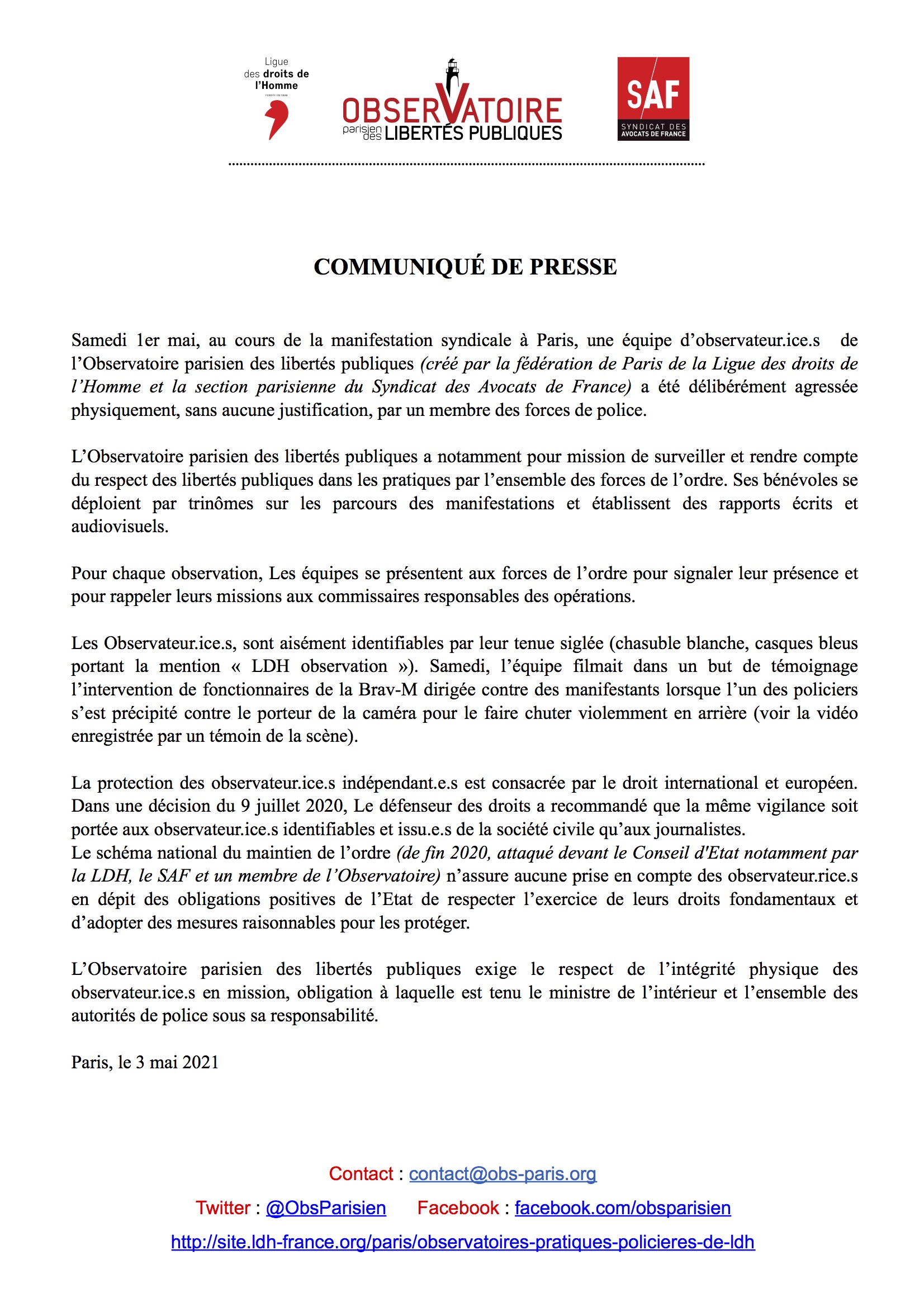 Un observateur filmant une compagnie de la BRAV-M a été délibérément agressé par un de ses membre : notre communiqué ⬇️ pic.twitter.com/C4U3C63xl3— Observatoire parisien des libertés publiques (@ObsParisien) May 3, 2021