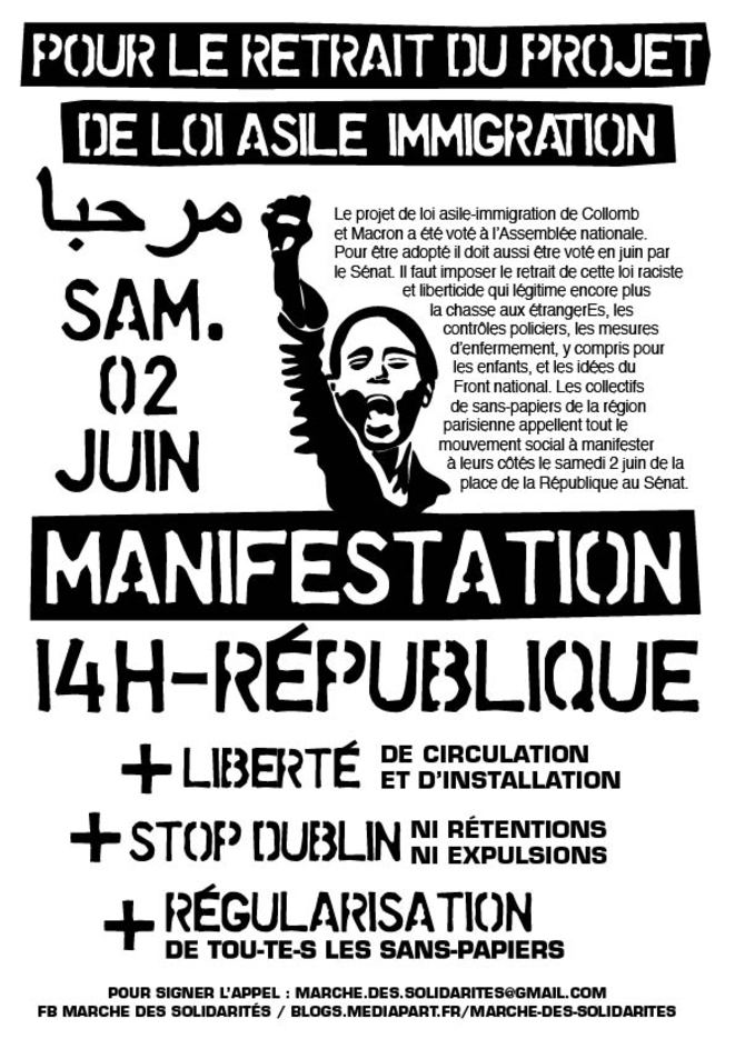 Le projet de loi asile-immigration de Collomb et Macron a été voté à l’Assemblée nationale. Pour être adopté il doit aussi être voté en juin par le Sénat. Il faut imposer le retrait de cette loi raciste et liberticide qui légitime encore plus la chasse aux étrangerEs, les contrôles policiers, les mesures d’enfermement, y compris pour les enfants, et les idées du Front National. Les collectifs de sans-papiers de la région parisienne appellent tout le mouvement social à manifester à leurs côtés le samedi 2 juin de la place de la République au Sénat.