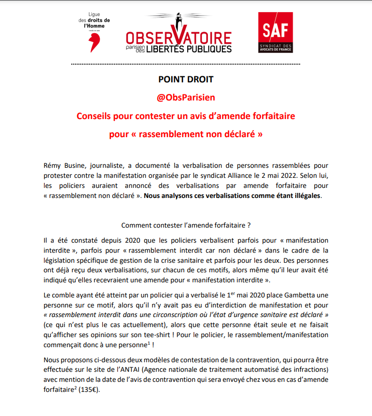👉Mis à jour après jurisprudence de @Courdecassation du 8 juin confirmant qu'on ne saurait être verbalisé si on participe à une manifestation non déclaréehttps://t.co/MoZl01dcjt pic.twitter.com/5uSNysuW6i— Observatoire parisien des libertés publiques (@ObsParisien)