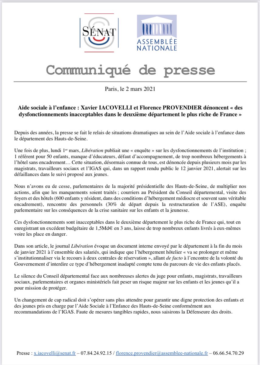Fait rare : en décembre 2019, le président du tribunal de grande instance de Nanterre et le procureur de la République d’un côté, et Vincent Maurel, le bâtonnier des Hauts-de-Seine, de l’autre, se sont ouverts de la situation dans deux lettres au patron du conseil départemental, Patrick Devedjian, mort depuis. Les deux textes pointent le manque de suivi, la multiplication des placements de jeunes à l’hôtel ainsi que les conditions sanitaires dégradées. Les magistrats s’inquiètent, plus précisément, de « l’effectivité des mesures de protection dans le 92 ». Ainsi « certains placements, décidés par le parquet ou le juge des enfants, ne sont jamais exécutés », et « les placements à l’hôtel pour de très jeunes enfants se multiplient », écrivent-ils. « Les services de solidarité territoriale qui remplacent depuis le 1er juillet le dispositif précédent au titre de la protection de l’enfance rencontrent manifestement des difficultés », insiste de son côté le bâtonnier.
