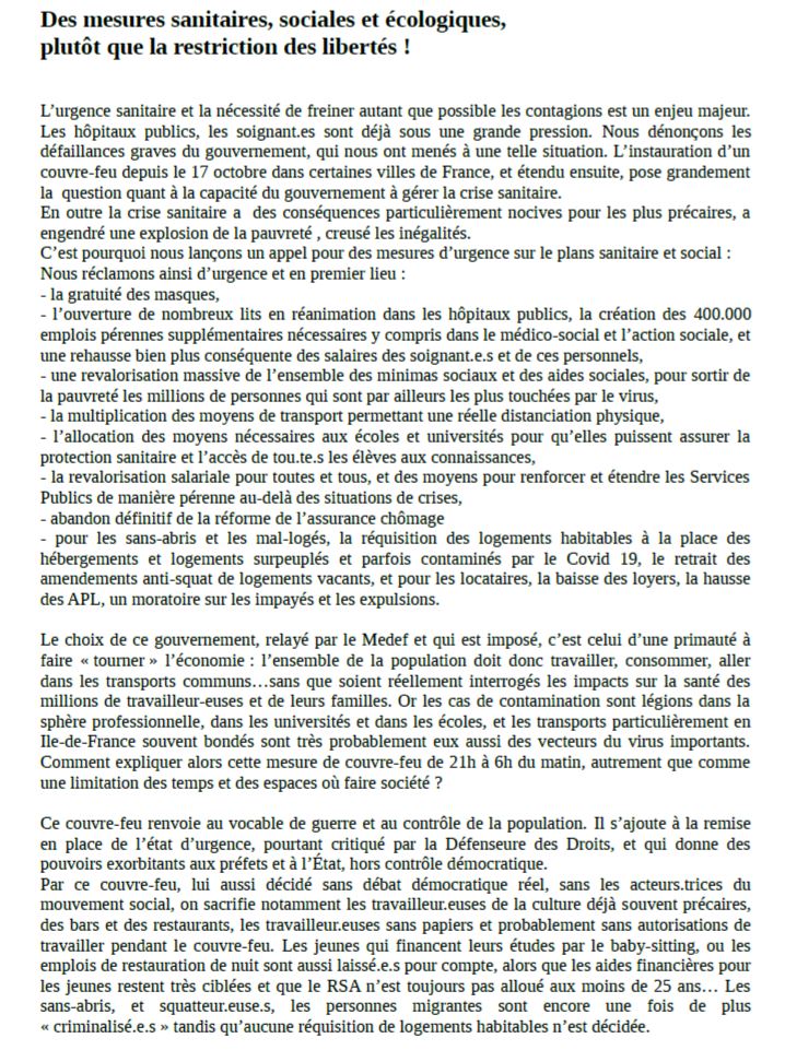 Signataires : - La CGT - La FSU - L’Union syndicale Solidaires - L’UNEF - L’UNL - ATTAC - Action Aid France - La Confédération paysanne - la Convergence nationale des collectifs de défense et de développement des services publics - Copernic - Le DAL - Emmaüs France
