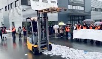 « La première destruction a eu lieu aujourd’hui », a annoncé en fin de journée la CFDT de Remade sur sa page Facebook en postant une vidéo d’un chariot élévateur roulant sur des centaines de téléphones et arborant une pancartes « salariés sacrifiés sans indemnités ». La scène se passe devant le site de Poilley sous le regard de plusieurs manifestants debout derrière une banderole avec le nom d’actionnaires et l’inscription « à votre tour d’être piétinés ».