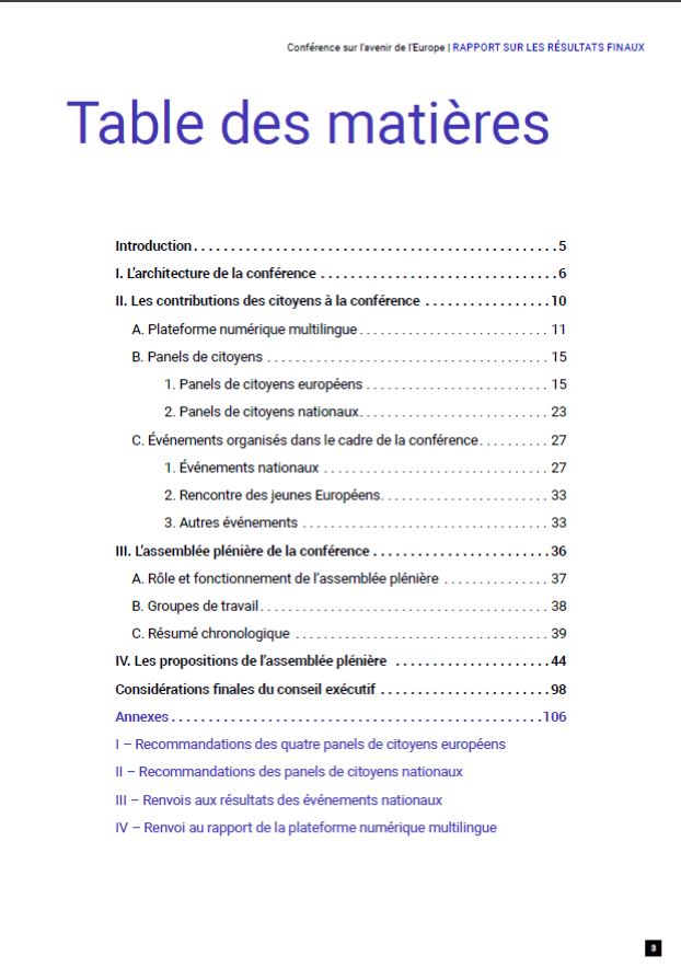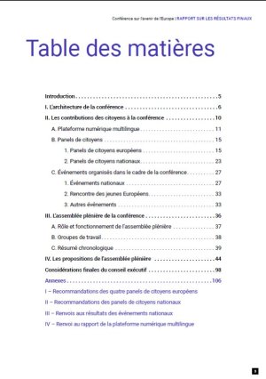 (...) Ce processus sans précédent de discussions, de débats et de collaboration entre citoyens et responsables politiques, qui s’est étalé sur une année, a abouti à un rapport articulé autour de 49 propositions comprenant des objectifs concrets et plus de 320 mesures dont les institutions de l’UE vont assurer le suivi, sur neuf thèmes : le changement climatique et l’environnement ; la santé ; une économie plus forte, la justice sociale et l’emploi ; l’UE dans le monde ; les valeurs et les droits, l’état de droit ; la sécurité ; la transformation numérique ; la démocratie européenne ; la migration, l’éducation, la culture, la jeunesse et le sport. Les propositions reposent sur des recommandations formulées par des citoyens réunis au sein de panels de citoyens européens ou nationaux, qui ont apporté leurs idées sur la plateforme numérique multilingue.