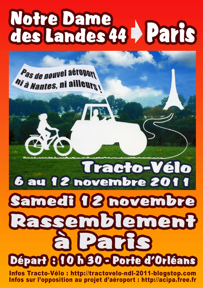 La coordination des opposants au projet d’aéroport de Notre-Dame-des-Landes (44) organise du dimanche 6 au samedi 12 novembre 2011 un déplacement en tracteurs et vélos (dit « tracto-vélos ») jusqu’à Paris pour interpeller nos décideurs nationaux, peser sur les négociations entre partis qui ne manqueront pas d’avoir lieu pour les Présidentielles 2012 et dénoncer encore une fois l’aberration de ce projet dans les conjonctures financière, économique, sociale et environnementale actuelles.