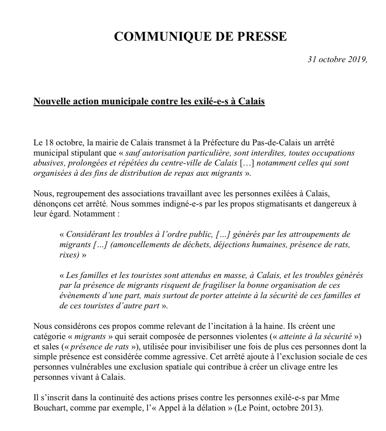 Beaucoup d’associations et d’organisations, comme @MdM_France @lacimade @caritasfrance @AubergeMigrants @Abbe_Pierre etc., dénoncent les nouvelles actions municipales qui stigmatisent et excluent les personnes #exilées de la vie sociale à #Calais.