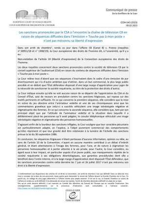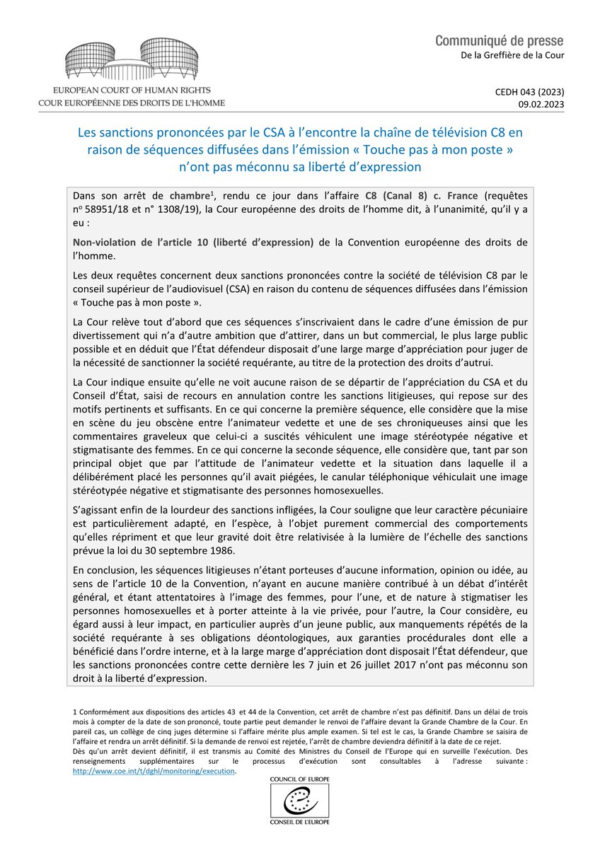 C8 a alors saisi la CEDH qui en rajoute à son tour. Pour les magistrats européens les sanctions reposent « sur des motifs pertinents et suffisants. » (...)