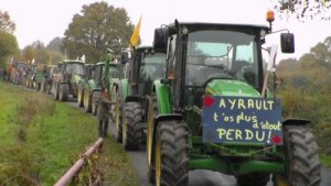 Dès 9h du matin, des milliers de manifestant-e-s ont convergé vers le bourg de Notre-Dame-des-Landes. Vers 11h, c’est un cortège immense qui s’est élancé en direction de la zone à défendre dans un chouette bazar. Immense, mais aussi plein de gens d’horizons divers : venus de la région ou de l’autre bout de la France ou de l’Europe ; jeunes ou plus âgé-e-s ; familles ou groupes en luttes ; comités locaux ou individu-e-s... Un cortège aux ambiances variées aussi entre battukadas, chorales improvisées ou non, ballade tranquille et bandes de clowns, parsemé d’un drapeau aux couleurs de la lutte : un cercle rouge entourant un avion barré. Une joyeuse bande accompagnée de tracteurs et de camions chargés d’éléments de charpentes, de divers matériaux de constructions, de chapiteaux, de marabouts. Selon nos comptages, on dénombrait environ 40 000 manifestant-e-s accompagné-e-s de plus de 400 tracteurs.