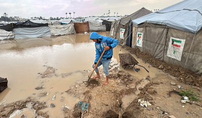 Sous un ciel sombre, les bourrasques d’un vent furieux et la pluie en rafales secouent les tentes. Des hommes s’accrochent aux structures d’un abri précaire, espérant qu’il ne s’envole pas. En vain. La minute suivante, elles s’effondrent sur de pauvres meubles déjà trempés. Plus loin, un enfant d’une dizaine d’années montre en hurlant, rage et désespoir mêlés, la tente de sa famille inondée, les quelques biens détruits. À l’hôpital Al-Shifa, le plus grand de la bande de Gaza, des trombes d’eau tombent des faux plafonds.