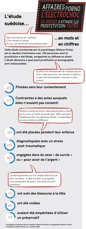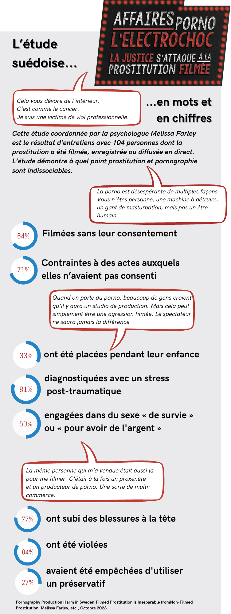 La porosité entre les univers pornographique et prostitutionnel apparaît au- jourd’hui clairement, confirmant ce que se tue à répéter le Mouvement du Nid, qui préfère au terme « pornographie » celui de « prostitution filmée » et qui soutient les nombreuses victimes qui ont eu le courage de témoigner et de se porter parties civiles dans les procès en cours. Jeunes, souvent polytraumatisées, leur parole est aujourd’hui d’une importance capitale et s’inscrit dans un contexte général plus favorable à l’écoute.