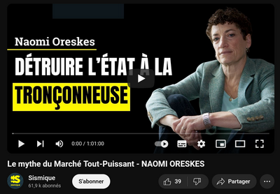 Dans son dernier ouvrage Le Grand Mythe, co-écrit avec Erik Conway, elle décortique les origines et la construction de ce qu’elle appelle le "fondamentalisme de marché", cette croyance quasi-religieuse en la capacité des marchés à résoudre tous les problèmes de société.