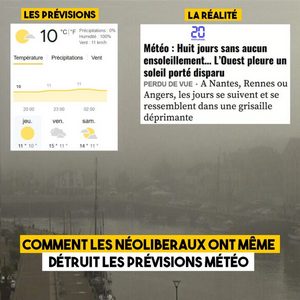 Comme Clément Sénéchal l’affirme : les catastrophes comme celles que vit l’Espagne en ce moment ne sont pas des catastrophes « naturelles », mais bien des catastrophes politiques. Elles sont le résultat de choix politiques et économiques. Les néolibéraux ont donc réussi à embrumer les alarmes des scientifiques sur le réchauffement climatique à long terme, et ils ont aussi détruit la météo du quotidien. Strike.