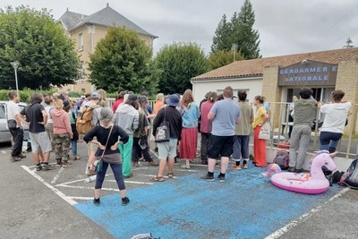 « Un couteau à beurre, des écussons, une bouteille de sirop, un imperméable kaki... » Sur l’air de La Complainte du progrès de Boris Vian, le porte-parole de Bassines non merci, Julien Le Guet, égraine la liste best-of des objets les plus absurdes confisqués durant la semaine d’action antibassines du 16 au 21 juillet. Son public ? Des dizaines de militantes et militants en file indienne devant la gendarmerie de Sauzais-Vaussais, à côté de Melle, venus récupérer leurs effets personnels lundi 22 juillet.