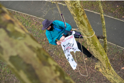 « Si on occupe des arbres, ce n’est pas vraiment par choix, mais c’est parce que c’est le seul moyen de se faire entendre. » À la cime de l’un des platanes de la rue de l’Estacade, Maka* et son camarade Bertrand* font partie des « écureuils », comme on appelle, entre militant·es, celles et ceux qui investissent ces arbres.