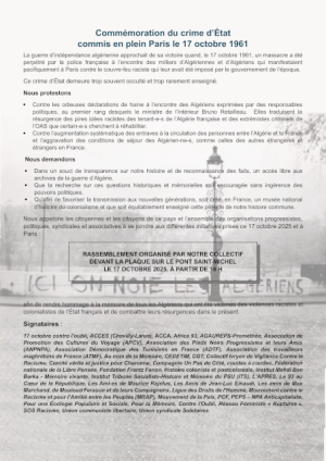 afin de rendre hommage à la mémoire de tous les Algériens qui ont été victimes des violences racistes et colonialistes de l’État français et de combattre leurs résurgences dans le présent.