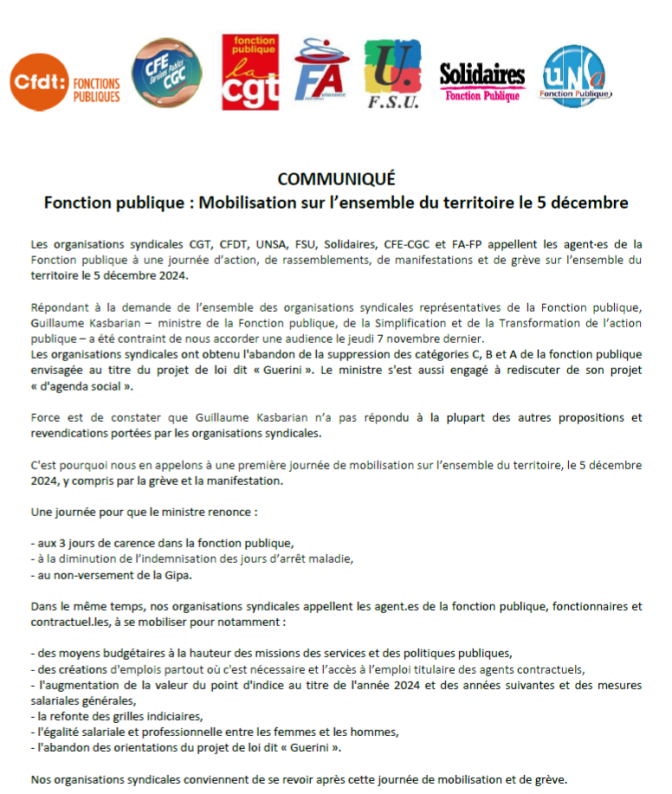 COMMUNIQUÉ Fonction publique : Mobilisation sur l’ensemble du territoire le 5 décembre