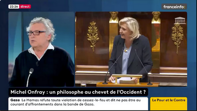 « Quand on interdit des gens d’être sur le service public, d’ailleurs je vous remercie de m’avoir invité ce soir… » Franceinfo brave la censure. « … Y a une dictature à bas bruit. — Y a une démocratie qui fonctionne, objecte Nathan Devers. — Que Marine Le Pen puisse être élue, je ne crois pas », rétorque Michel Onfray, accusant ses adversaires de « se débrouiller pour qu’elle ne puisse pas aller aux présidentielles ». Grâce à une « justice politique », comme le dit Pascal Praud sur CNews. (...)