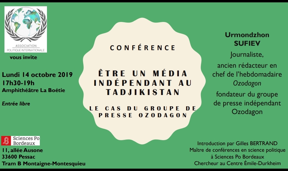 conférence sur la situation des médias indépendants au Tadjikistan, à Sciences Po Bordeaux le lundi 14 octobre.