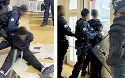 « Alors qu’un élève tapait de toutes ses forces sur le bouclier, les deux équipiers se sont regardés et, par surprise, l’ont plaqué au sol, l’ont menotté face contre terre puis l’ont plaqué au mur comme pour une fouille au corps », continue l’enseignante. Avant de conclure : « À la fin, deux des élèves s’étaient blessés, le bouclier était maculé de sang. »