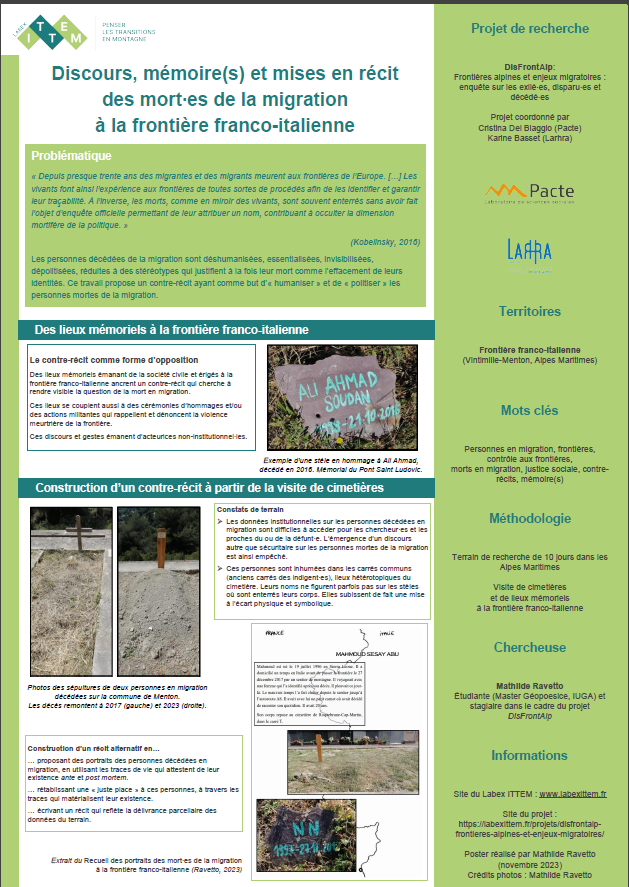 A travers le projet Disfrontalp – Frontières alpines et enjeux migratoires, enquête sur les personnes exilées, disparues et décédées, l’objectif est de constituer un réseau alpin de recherche chargé de créer, publier et diffuser une base de données des personnes en migration, qui, depuis l’Italie ou les pays situés sur la « route des Balkans », sont décédées en tentant de traverser les Alpes pour trouver refuge en Europe occidentale. Les données récoltées montrent que, depuis 1993, 149 personnes sont décédées en tentant de traverser une frontière alpine, dont 84% depuis 2015, soit depuis que ces mêmes frontières ont été militarisées et les contrôles augmentés.