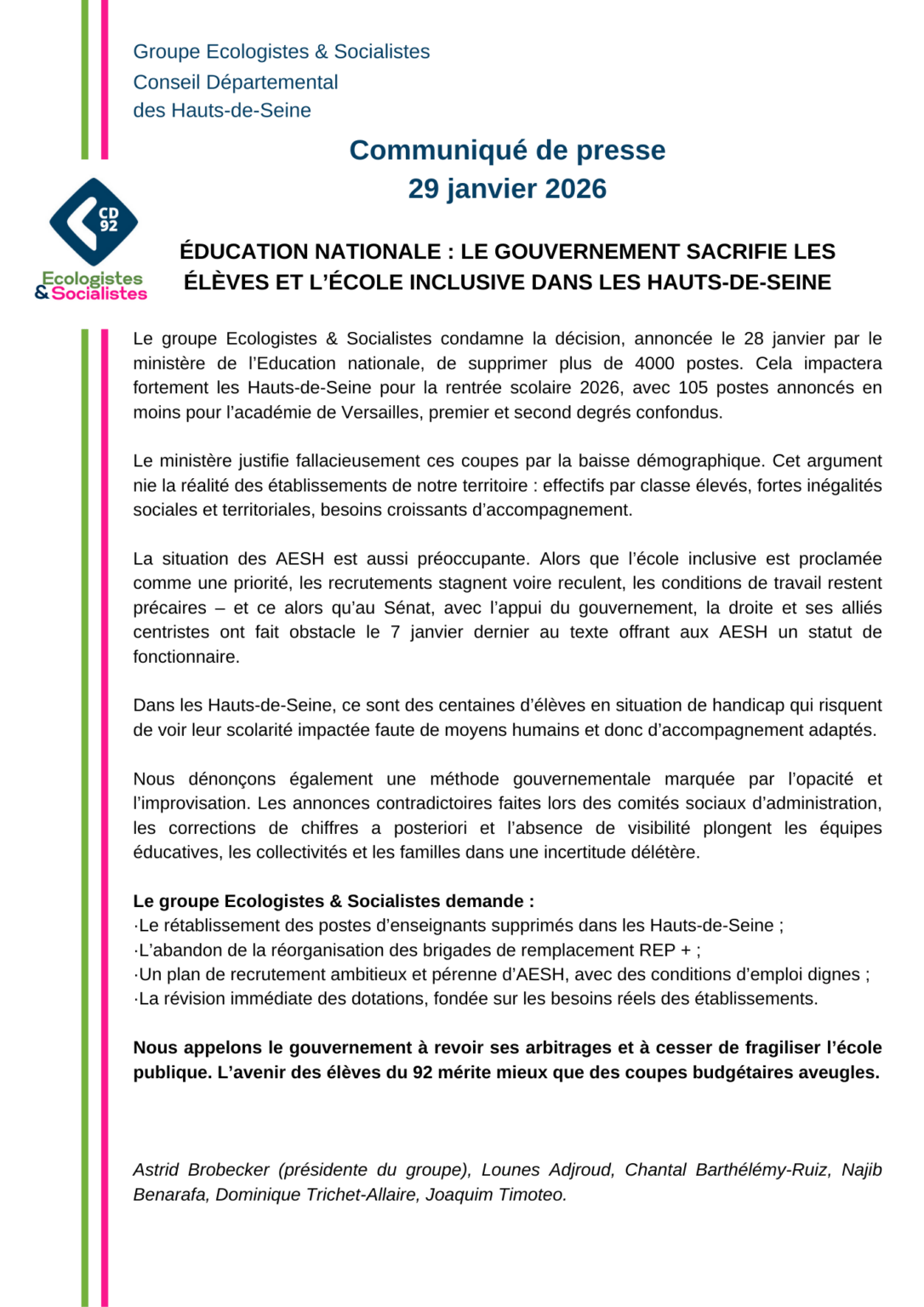Groupe écologistes et socialistes/communiqué, 29 janvier 2026