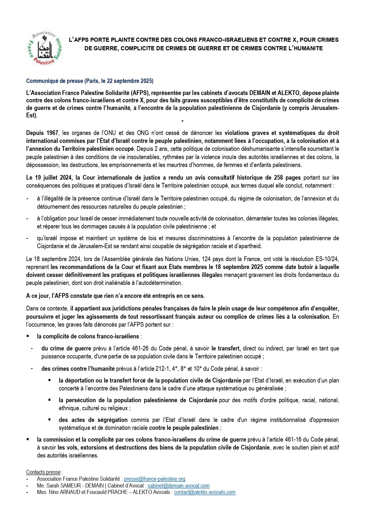 C’est une initiative portée par l’Association France Palestine Solidarité (AFPS), avec le soutien de deux cabinets d’avocats : Demain et Alekto. (...)