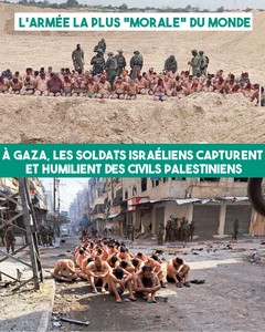 Des photographies de plusieurs dizaines de civils palestiniens captifs, à genoux et à moitié nus, parfois les mains liées dans le dos et les yeux bandés, ont été partagées par un reporter fasciste israélien sur les réseaux sociaux. Le journaliste Yinon Magal se gargarise ainsi des traitements inhumains et dégradants subis par les civils palestiniens entre les mains des militaires israéliens.