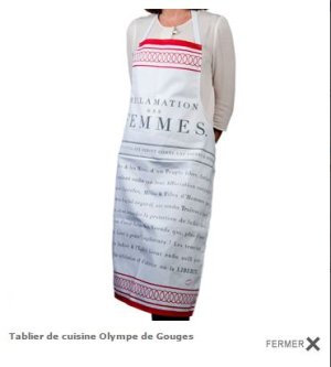 Sous l’image de l’accessoire, qui pouvait être acquis pour la somme de 24 euros, il était inscrit : « Tablier de cuisine illustré d’une affiche révolutionnaire d’Olympes [sic] de Gouges, rédactrice de La Déclaration des droits de la femme et de la citoyenne, qui revendique le droit des femmes à choisir librement leur époux. »
