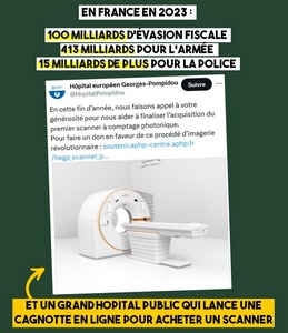 (...) ➡️ En cette fin 2023, le 28 décembre, l’un des plus importants hôpitaux publics du pays en est réduit à lancer un appel aux dons sur les réseaux sociaux pour s’acheter… un scanner. C’est le message publié par l’hôpital parisien George Pompidou : « nous faisons appel à votre générosité pour nous aider à finaliser l’acquisition du premier scanner à comptage photonique » accompagné d’un lien vers une cagnotte en ligne.