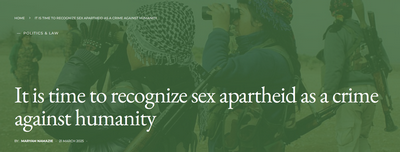 L’apartheid va au-delà de la discrimination et de la persécution. Il s’agit d’un régime institutionnalisé d’oppression et de domination systématiques. L’apartheid racial était la domination d’une race sur une autre et un système de suprématie blanche. Il est grand temps de reconnaître que l’apartheid sexuel existe, qu’il s’agit de la domination d’un sexe sur l’autre et d’un système de suprématie masculine.
