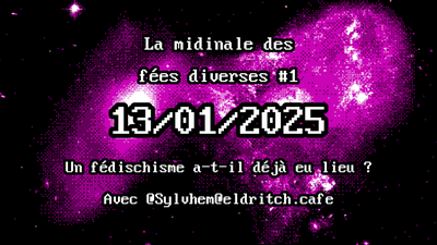 Bienvenue dans les Chroniques du fédischisme, une émission d’infos et d’actualités politiques autours des Fées Diverses et de leurs univers, présentée par @MicroCheapFx chez toot.aquilenet.fr et @AdaLaNerd chez eldritch.cafe.