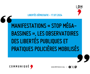 Une équipe d’une cinquantaine d’observateur·ices, membres des Observatoires des libertés publiques et des pratiques policières de Poitou-Charentes, Gironde, Toulouse, Angers, Nantes, Rennes, Paris, Seine-Saint-Denis, Strasbourg et Marseille, sera présente du 16 au 21 juillet en Nouvelle Aquitaine pour documenter le maintien de l’ordre à l’occasion de la mobilisation citoyenne « Stop Méga-Bassines ».