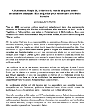 Les organisations Refugee Women’s Centre, Médecins du Monde, Utopia 56, Roots, Salam et Human Rights Observers expliquent dans un communiqué commun avoir déposé mardi une requête en référé liberté devant le tribunal administratif de Lille.