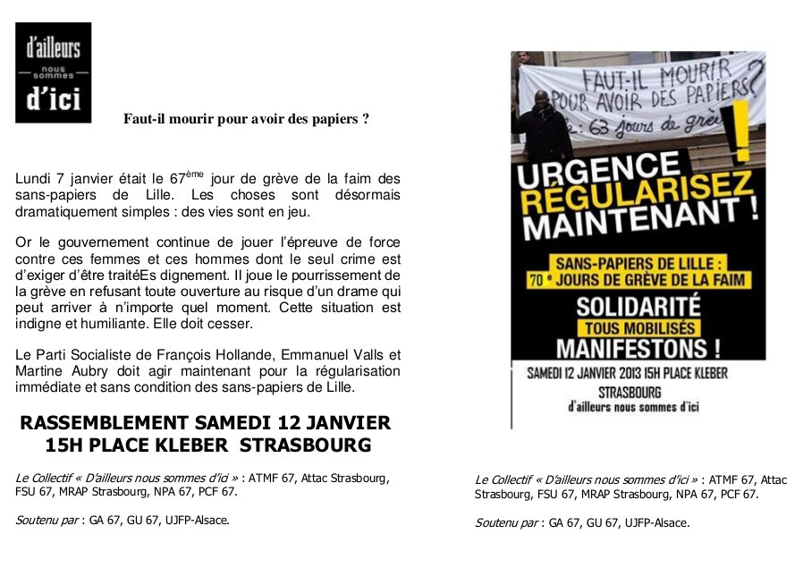 occupation de la mairie de Lille, Rassemblement en soutien aux grèvistes de la faim CSP 59 :samedi 12 janvier 15H Strasbourg,