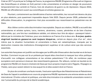 Programme PAUSE : La France exclut les lauréats de Gaza