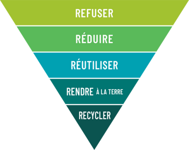 Ces 5R expriment des priorités à appliquer dans l’ordre. On refuse ce dont on n’a pas besoin, on réduit ce dont on a besoin, on réutilise ce qui peut l’être, on composte les matières organiques (“rendre à la terre”) et on recycle les matières qu’on ne peut ni réutiliser ni composter. (...)