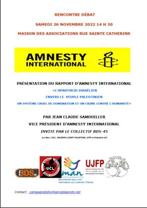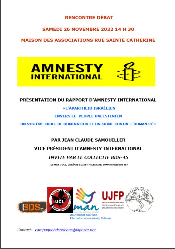 samedi 26 novembre 2022 à Orléans : PRÉSENTATION DU RAPPORT D’AMNESTY INTERNATIONAL « L’APARTHEID ISRAÉLIEN ENVERS LE PEUPLE PALESTINIEN UN SYSTÈME CRUEL DE DOMINATION ET UN CRIME CONTRE L’HUMANITÉ